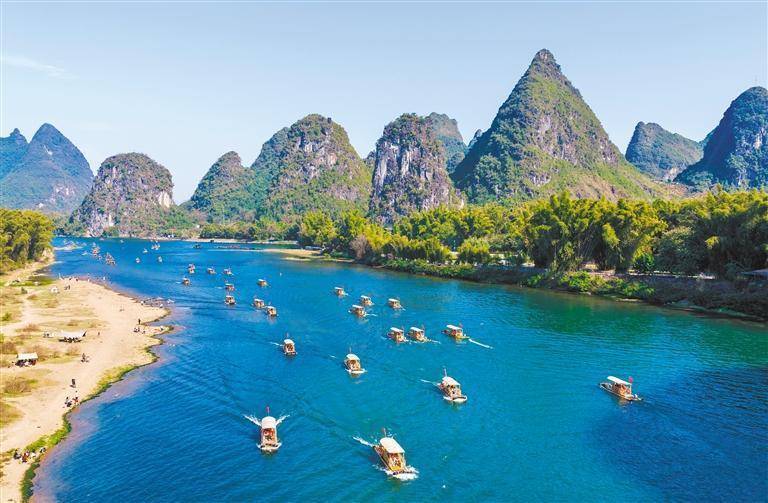 2月20日,广西桂林市阳朔县漓江,搭客乘坐竹筏在绿水青山间穿行。夏立慧摄(中经视觉)