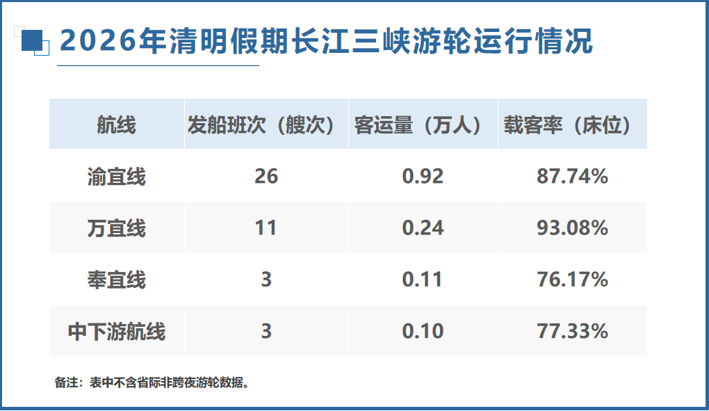 4月9日,来自市港帆海事事务中心、重庆航运往来所的数据泄漏,辉煌假期4月4日—6日,长江三峡游轮发船47艘次,为2025年辉煌同时的92.2%;完成客运量1.42万东谈主次,较2025年同时增长8.7%。与客岁同时比较,游轮平均载客率(床位)86.8%,较2025年同时高潮5.3个百分点,船舶运用率捏续栽植。