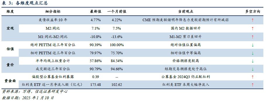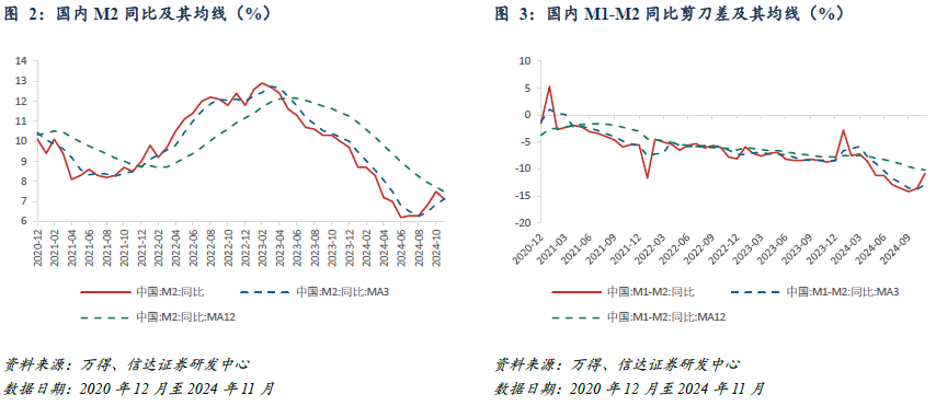 国内宏不雅层面,国度统计局于2024年12月13日公布了2024年11月份经济数据,2024年11月国内M2同比为7.1%,前值为7.5%。M1-M2同比剪刀差为-10.8%,前值为-13.6%。国内M2同比与M1-M2剪刀差短期回升,但抓续性仍待不时不雅测,因此在国内的维度,刻下环境下模子仍看好红利逾额收益的抓续性。