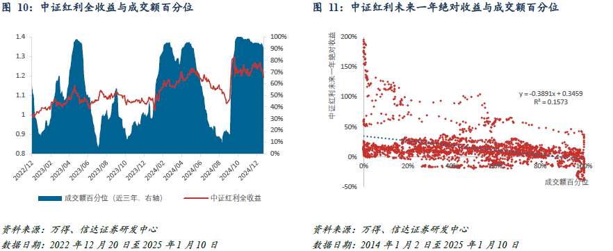 达成2025年1月10日,中证红利成交额处于近三年90.79%百分位,一个月前为94.66%百分位,成交拥堵度较前期有所裁减,带入追溯方程,追溯模子计算异日一年统统收益为-0.74%。