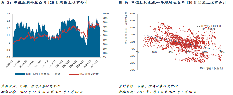 A股历史上短期回转效应强于动量效应,因此在价的维度,咱们通过计较统共位于120日均线之上的中证红利指数身分股的权重共计,统计站在半年均线上的身分股权重共计与中证红利异日一年统统收益的关系性。2017年于今,两者关系性统共为-43.86%,追溯T统计值-20.11。当权重合在30%以下时,可见中证红利异日一年统统收益为负的概率较小相对安全,当中证红利权重合在80%支配时,需警惕回转风险。