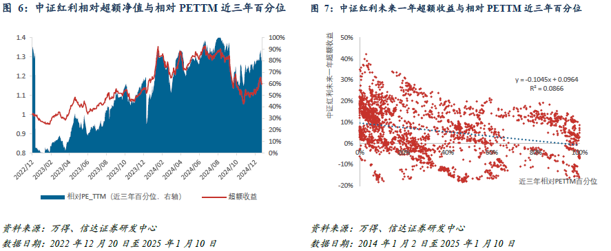 在相对PETTM层面,以中证红利PETTM估值除以万得全A PETTM估值,计较中证红利的相对估值,测算与中证红利异日一年相对万得全A逾额收益的关系,两者关系性统共为-29.42%,追溯T统计值为-15.18。笔据估值与收益散点图,历史上,当中证红利相对PETTM处于历史低位时,有较为可不雅的逾额收益赔率,但若相对PETTM过高,不错看到逾额收益赔率渐渐着落,性价比有所裁减。
