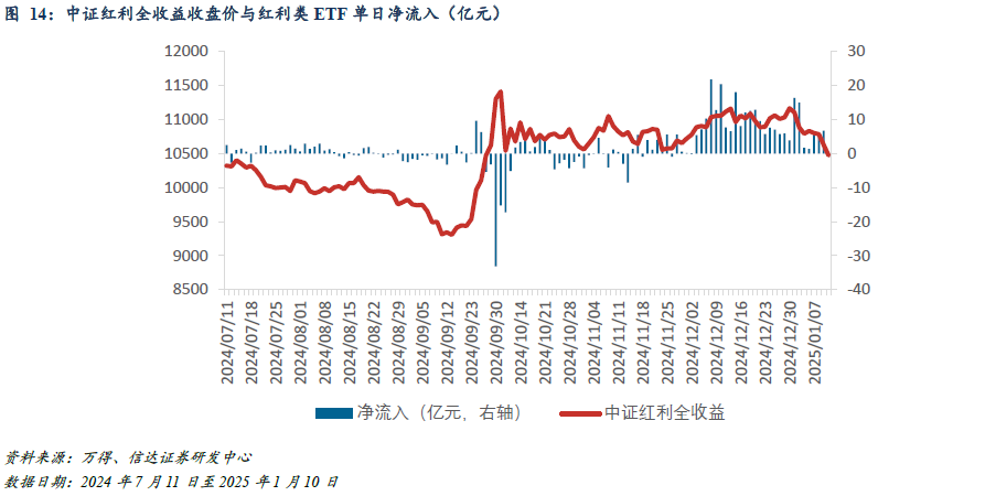 统计阛阓上统共A股红利类ETF的逐日资金净流入情况(筛选次第:基金追踪指数中包含“红利”或“股息”要津字,剔除未设立、已到期的基金,和投资于港股的基金,以及ETF联结基金)。本年以来,A股投资者抓续买入红利类ETF,中证红利走势与ETF资金流入流出情况一定进程呈正关系。