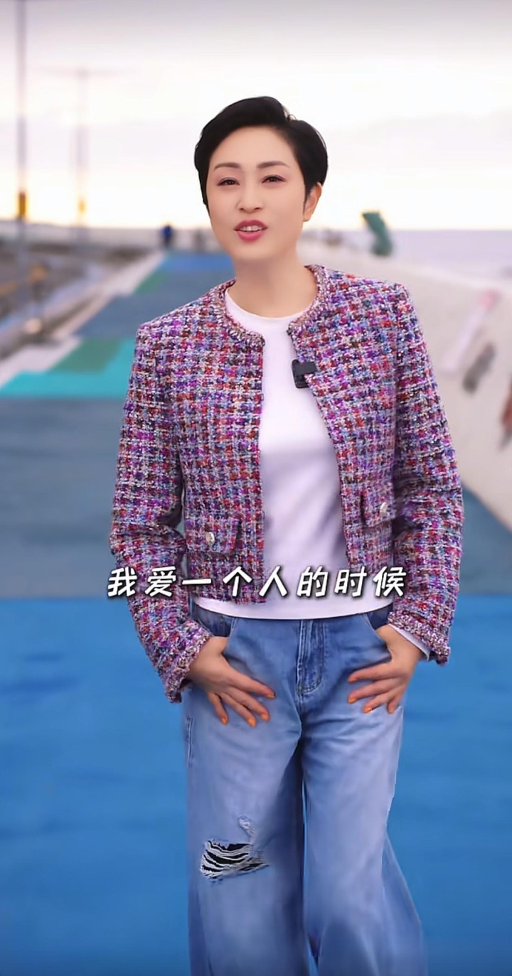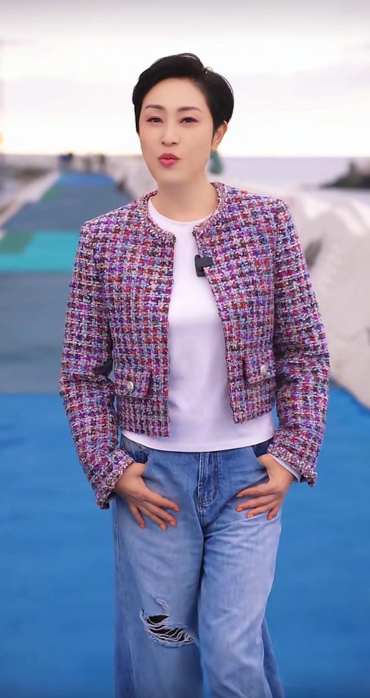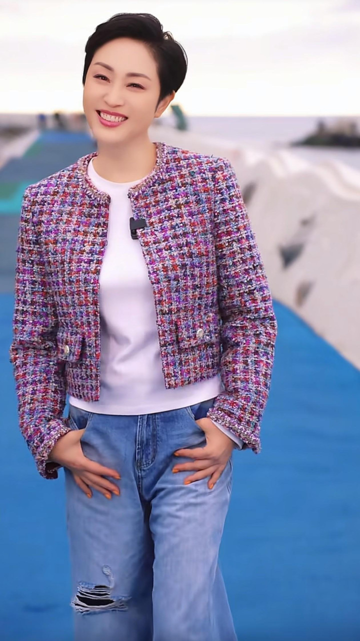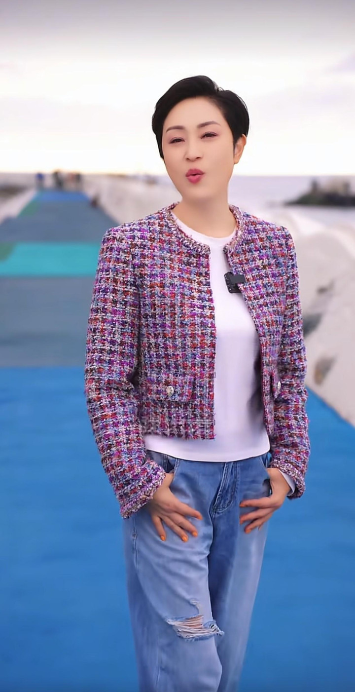上半身穿的是一件彩色粗花呢短款外衣,面料是那种毛茸茸的编织感,内部混着红、紫、蓝、白等多种神气的纱线,看起来像把彩虹织进了穿着里。外衣是无领的策画,边际有当然的毛边,显得随心又好意思丽,口袋上有两颗银色的金属纽扣,细节邃密无比又不刻意。