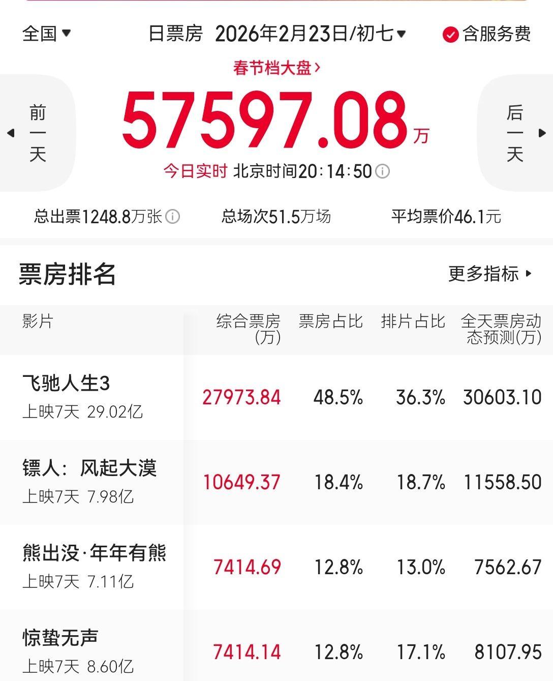 《熊出没·年年有熊》在大年头七重返单日票房前三,当作春节档确实的“钉子户”,在春节档公映前两天,影片曾跃入单日票房三甲,时隔多日在春节档临了一天重回前三。当今《熊出没·年年有熊》在豆瓣评分6.7分,基本防守了系列的基本水准。按照当今的票房走势,该片有望继2023年的《熊出没·伴我熊“芯”》(14.95亿)和2024年的《熊出没·逆转时空》(19.84亿)后,成为系列第三部票房 10 亿 + 的大电影。