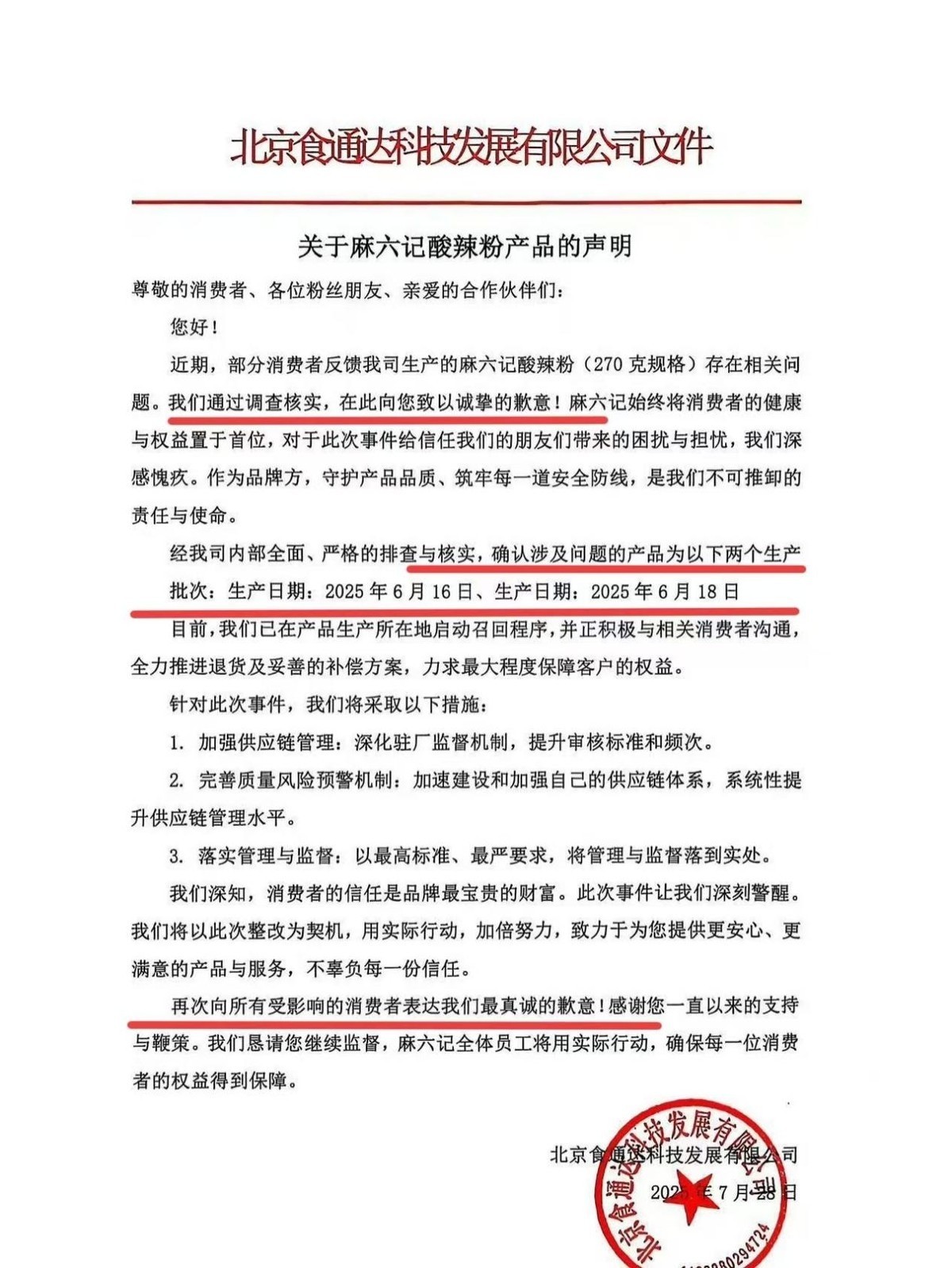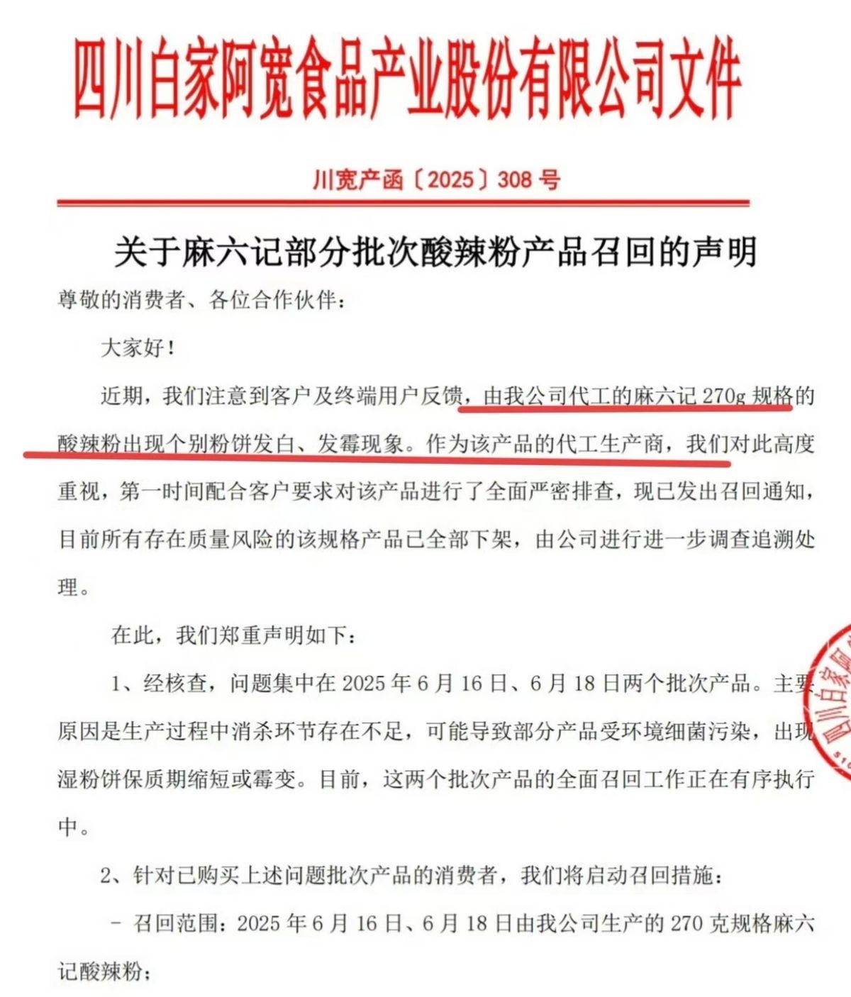 本体明确指出:咱们是麻六记酸辣粉的代工方,居品出了问题,咱们谈歉独立即下架量度批次。