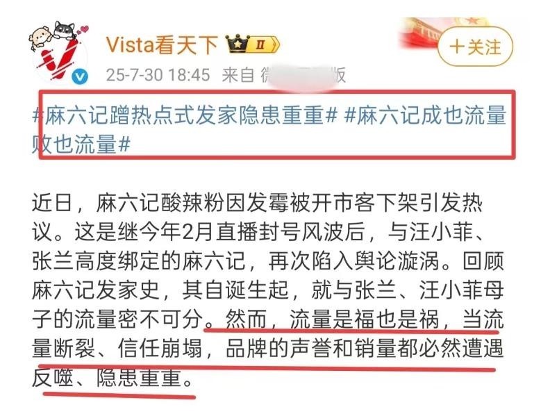就在近日,官方配景媒体径直发文点评,标题就很浓烈:麻六记靠蹭热门发财隐患重重,成也流量败也流量!
