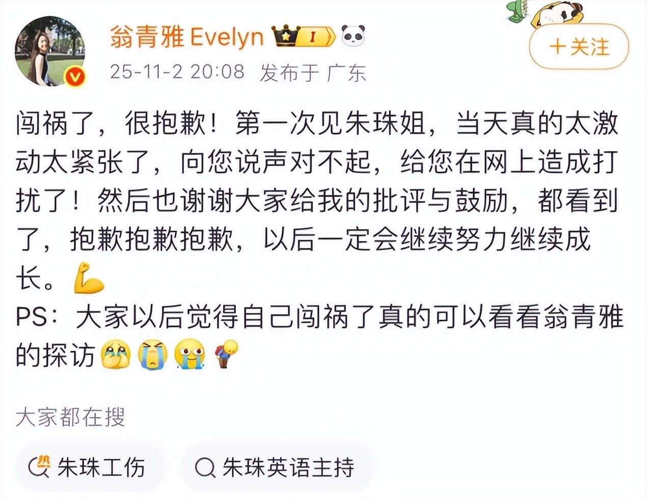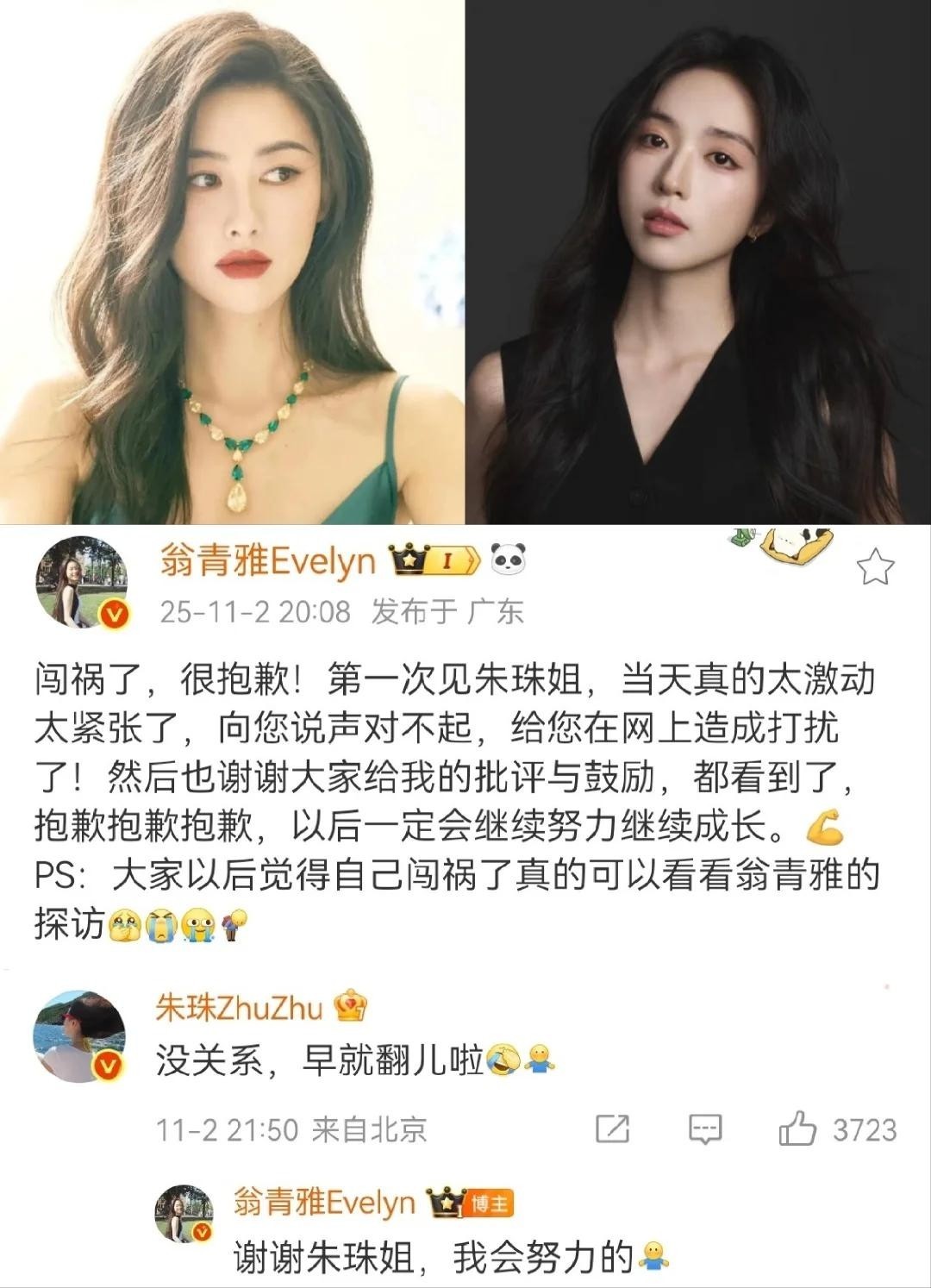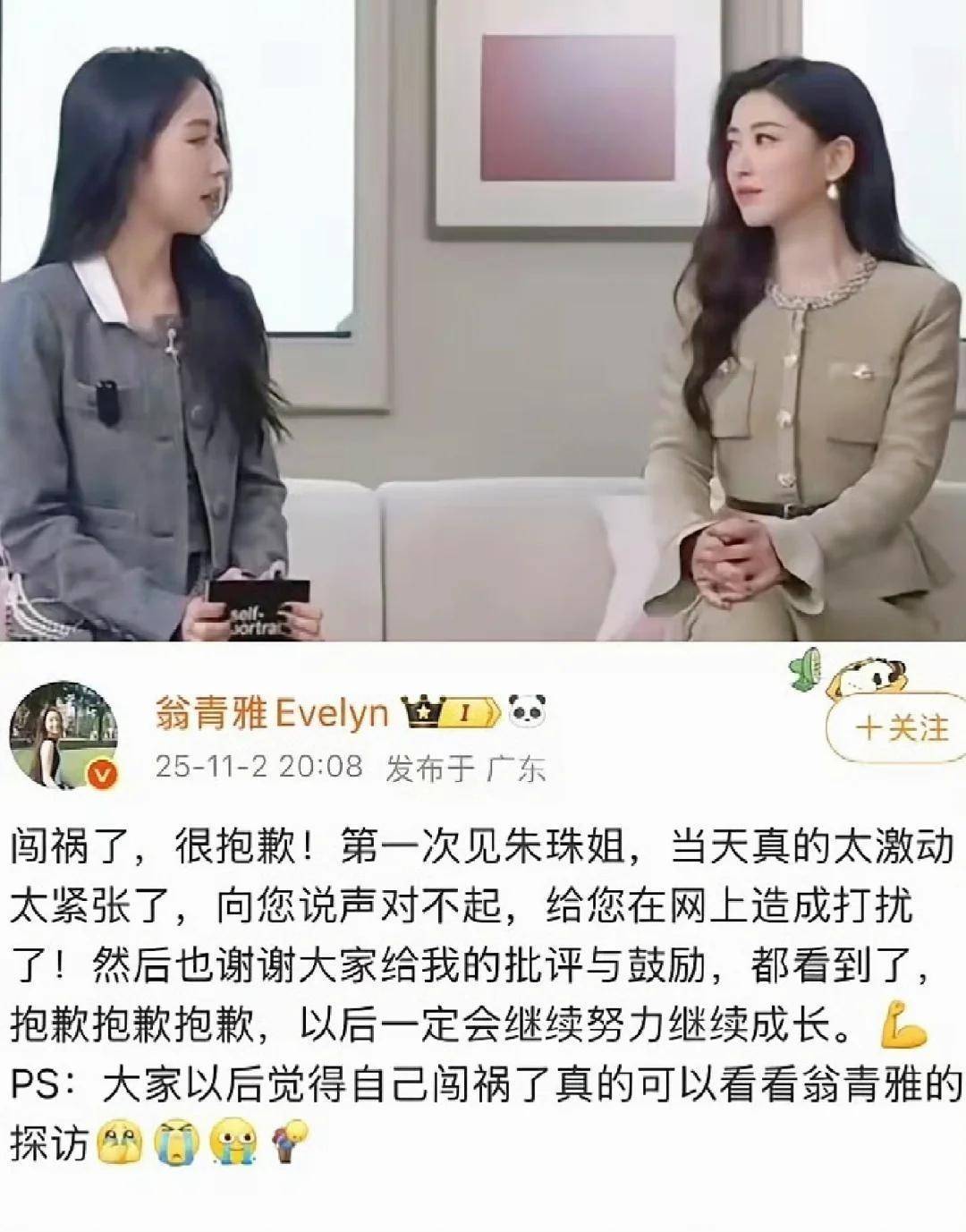 2. 这场风云始于11月1日的一场品牌活动访谈。朱珠当作分量级嘉宾受邀出席,而担任主理东谈主的,则是昨年通过恋综《心动的信号7》崭露头角的翁青雅。