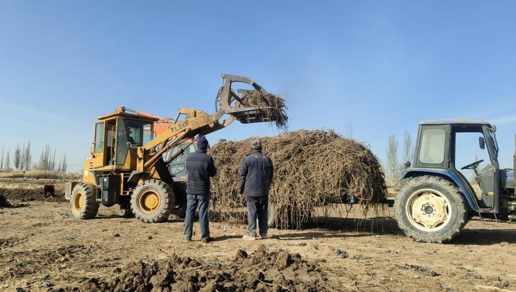r采收现场,大型采挖机穿梭功课,一根根粗壮的甘草破土而出,工东谈主们紧随自后进行捡拾、装车,现场一片勤奋景观。
