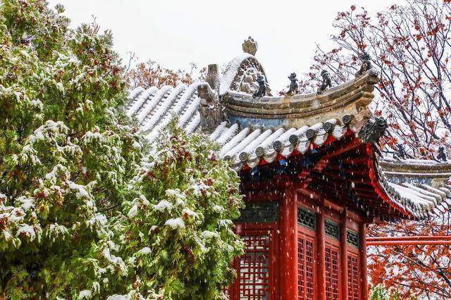 红墙映雪,黛瓦凝霜,飞檐与翘角杂沓相依,晕染出灵动的天空线。雪花簌簌而下,轻轻为这份高古镀上一层柔光白边,每一处棱角皆浸着温和。