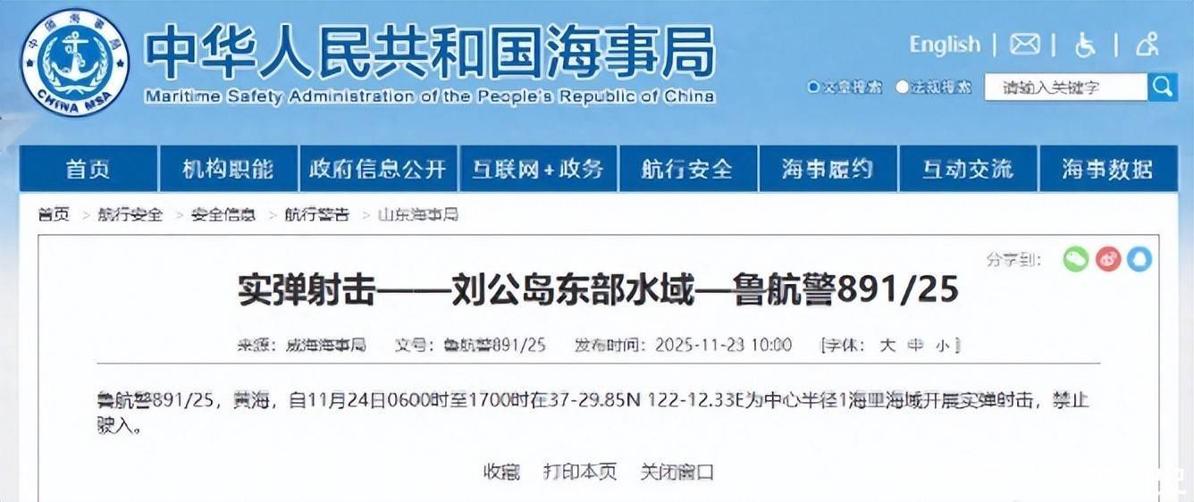 而就在日方不停“倒打一耙”时,安详军却莫得停驻脚步,11月24日凌晨,官方发布飞翔告诫,晓谕安详军将在刘公岛东部水域进行实弹射击。