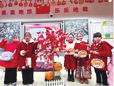 上昼9点起,校园变身“传统文化体验馆”,迎新主题课上,老师和家长和洽诠释春节故事、带人人写对联、剪窗花,随后,“校园庙会”吵杂开市!各班级化身特质摊位,习惯体验、好意思食共享、兴味互动……孩子们在逛、玩、品之中,感受原汁原味的中国年。